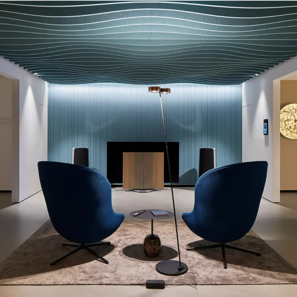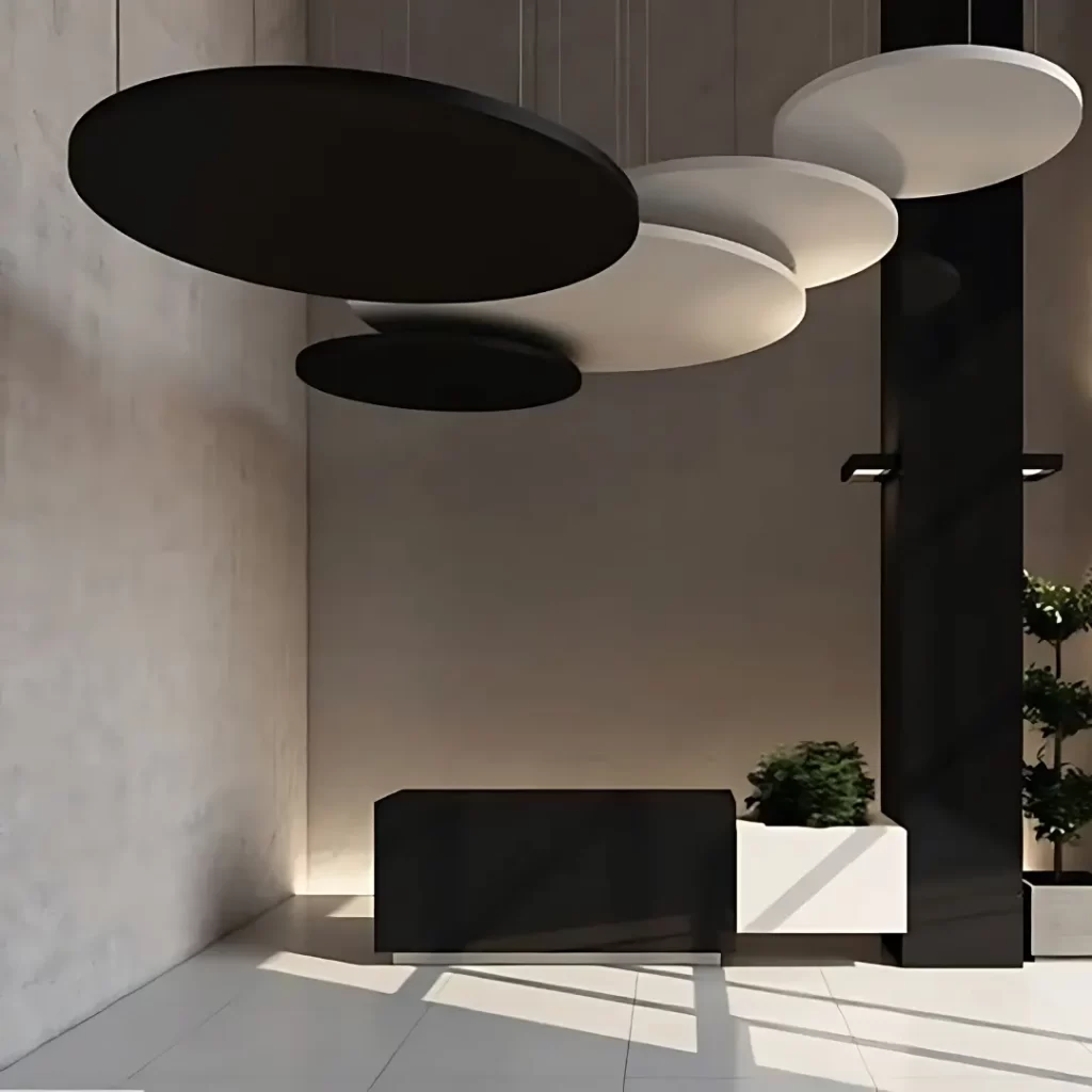 These are curved panels, often resembling airplane wings, offer a visually striking aesthetic that complements contemporary spaces. But don’t be fooled by their looks – wing baffles are highly effective sound absorbers. The curved design helps to scatter sound waves in multiple directions, further reducing echo and overall noise levels. They’re a perfect choice for reception areas, conference rooms, or any space where you want to combine style with acoustic control.