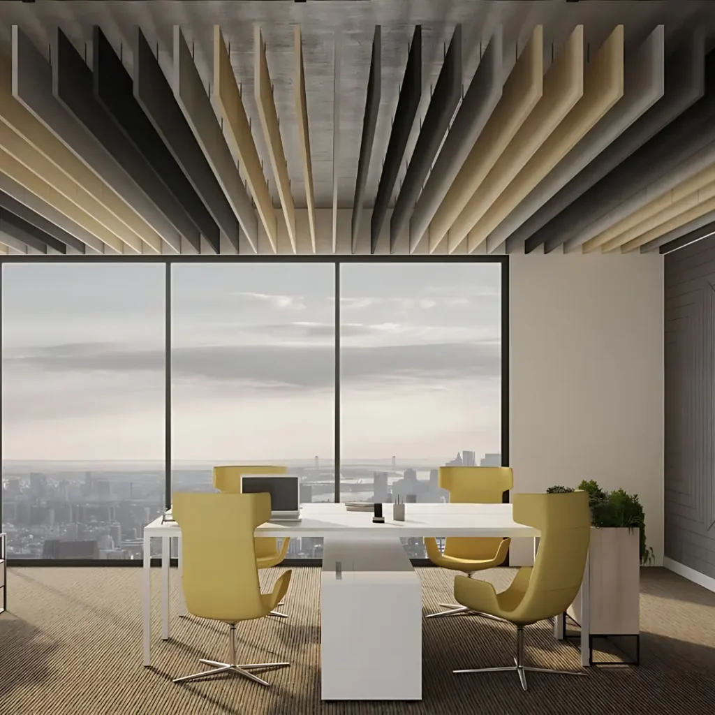Acoustic Baffles are suspended sound-absorbing panels designed to reduce echo and control noise in large and open spaces. Installed vertically from ceilings, they effectively absorb sound from multiple directions. Ideal for offices, auditoriums, retail areas, and industrial environments in the UAE, acoustic baffles improve speech clarity and acoustic comfort while adding a modern, architectural design element to the interior space.